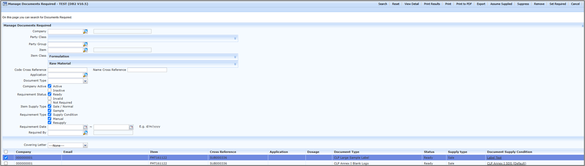 Reset: This will remove the search criteria you have entered. View Detail: A floating window will open and display the Requirement Status, Item Supply Type and Requirement Type. Print Results: Prints a report showing the search results and the format of the report can be changed. Print: Prints to a physical printer and logs ‘supply’ of the documents to the customer so that the document appears in the Documents Supplied list for the customer. Print to PDF: Generate PDF files for the batch of documents highlighted, along with covering letter if required. This also logs ‘supply’ of the documents. If you select documents for multiple customers/parties then multiple zip files will be created, each representing one customer. From here there is an option to email documents – note this emails all the document zip files to one recipient. Assume Supplied: Mark the document ‘Supplied’ with associated actions, i.e. the document will appear in Documents Supplied list for the Company. Suppress: Suppress the document from being printed. Note – the system will only trigger the document as required again if the Item is resupplied to the Company. Remove: Remove the document from the Documents Required list. Note – the system will trigger the document as required again if it fulfils the Document Supply Conditions (as determined during the ongoing assessments of Items, properties and documents supplied). Set Required: Set the Document as ‘Required’