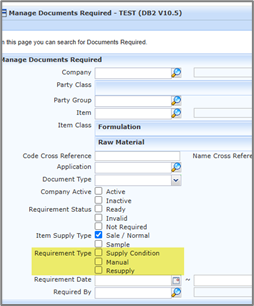 Manage Documents RequiredDocuments include Safety Data Sheets, Certificates and Specifications which contain business critical information which is required to be kept up to date and passed on to customers. Formpak automatically creates new versions of previously created documents and determines who needs them using the results of Automatic Processing. Documents can also be ‘required’ by manually being triggered by choosing ‘Print Later’ from Print a Document for an Item. The requirements about when documents should be supplied are specified individually for each document in the Document Supply Conditions. For example a Safety Data Sheet may be required to be updated if specific properties and values change, but only send updated versions to customers who have received a sample or order in the last 12 months. Using Manage Documents Required Manage Documents Required allows you to find documents which need to be supplied and re-supplied. You can search by Company, Item, Application, Document Type or combinations of these. It is also possible to view documents with different Status, e.g. ready or invalid. You can also filter by the Requirement Type